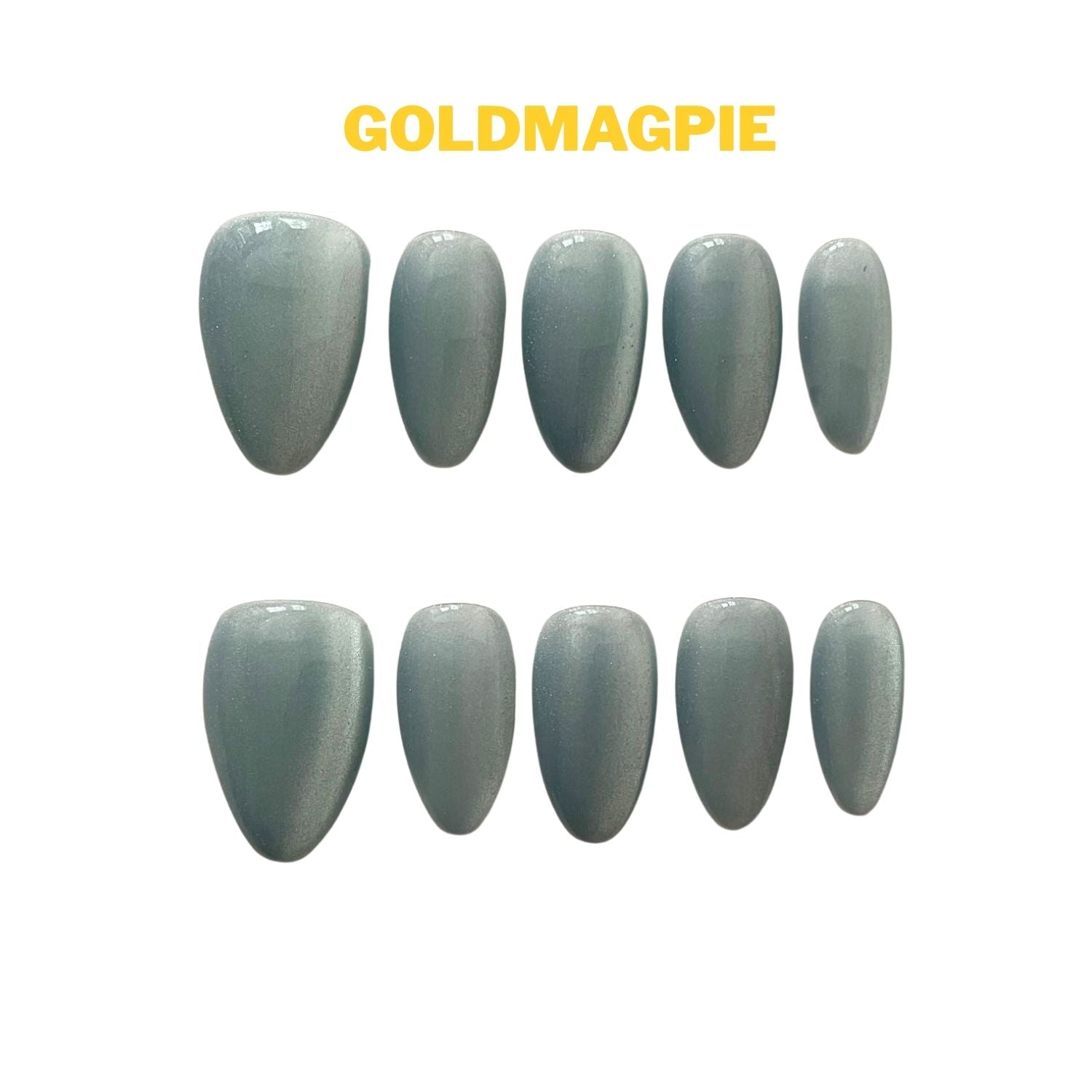 Elevate your style with our Sage Green Cat Eye Press On Nails by GOLDMAGPIE.